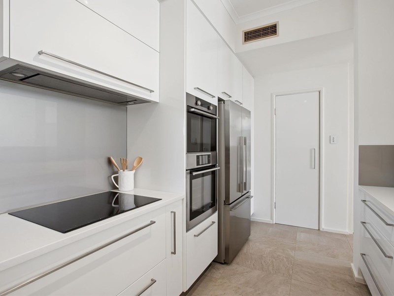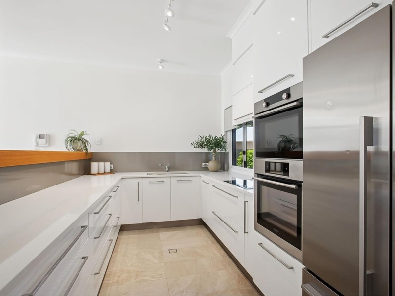 - Modern kitchen with white high-gloss, soft-close cabinetry, stone benchtops & quality appliances, including integrated Asko oven + microwave + induction cooktop & large walk-in pantry; concealed Euro-style laundry