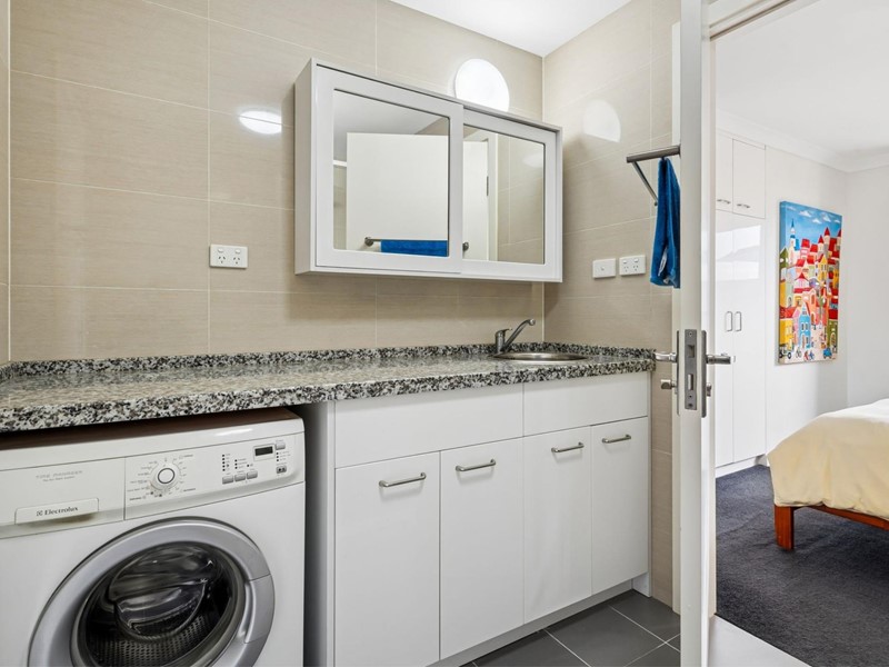 - Clever & Chic Bathroom: Sparkling ‘Jack & Jill’ bathroom/laundry combo with a glass screen shower, floor to ceiling tiles and elongated vanity with plentiful storage.