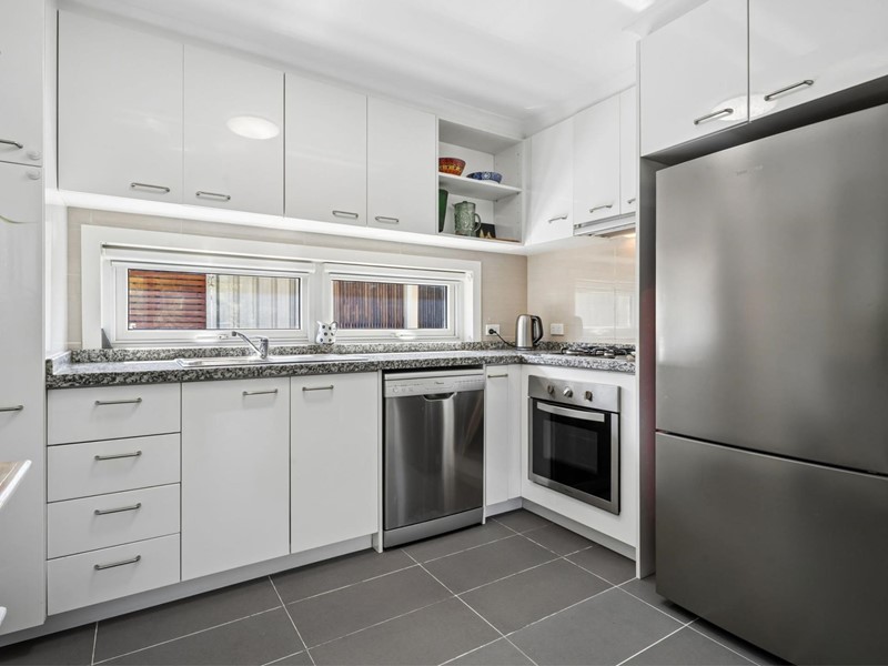 - Modern Culinary Space: Sleek kitchen featuring granite benchtop, stainless steel electric oven, gas cooktop, dishwasher, ample storage, and a stylish splashback.