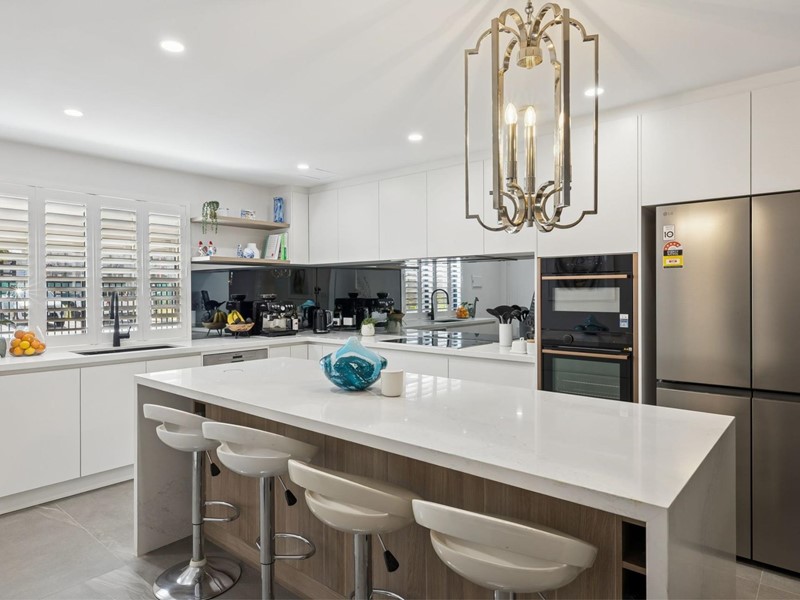 - A highlight is the kitchen featuring stone benchtops, customised storage, large island bench with striking dimmable pendant light & pop-up power, Neff steam/conventional oven & separate integrated microwave/air fryer oven, Asko convection cooktop, 24-bottle b/in wine rack & more