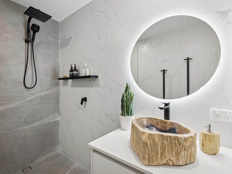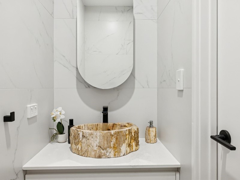 - Custom petrified timber basin is a standout feature of both the bathroom & powder room
