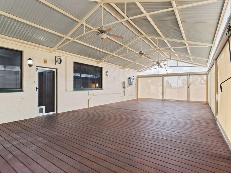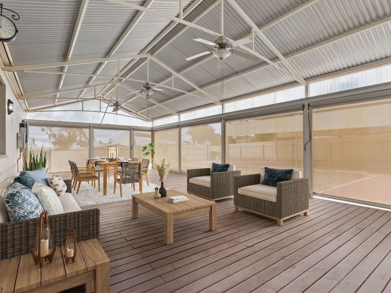 - Huge timber patio (12.0 x 6.0m) with peaked Colorbond roof, ceiling fans & roller blinds on all sides