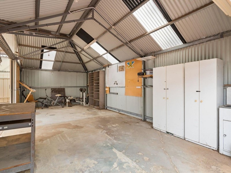 - Colorbond powered workshop (9.0 x 4.0m) with sliding side door, front roller door & sink